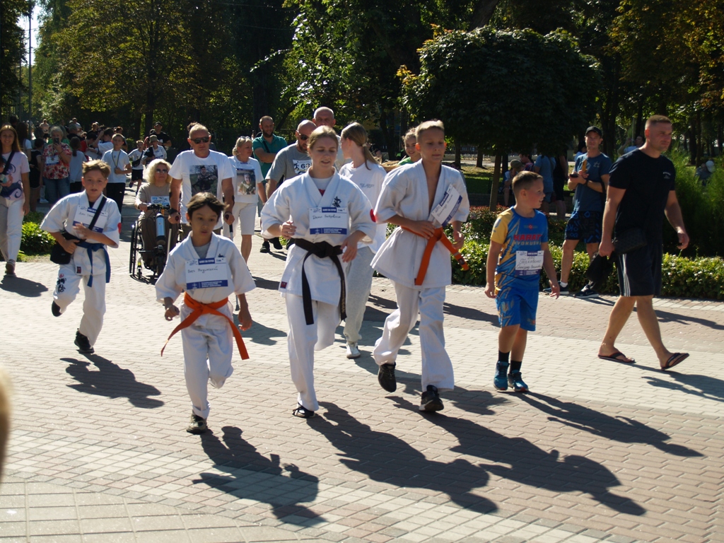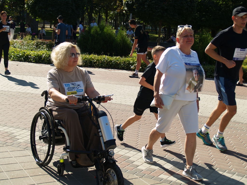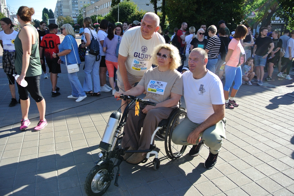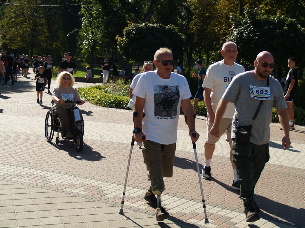 Разом із ним на двох протезах мужньо подолав 2 км і Анатолій Фатєєв герой АТО, який втратив на війні обидві ноги, а нині волонтер, який збирає допомогу своїм побратимам на фронті. На візку долала дистанцію всесвітньовідома спортсменка, багаторазова переможниця і призерка Паралімпійських ігор, плавчиня Олена Акопян.
